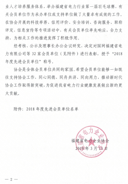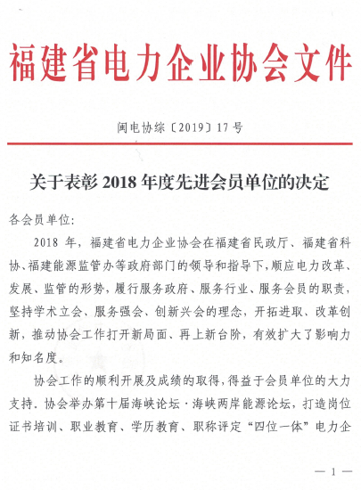 2019年3月11日,億創電力建設集團有限公司被福建省電力企業協會授予“2018年度先進會員單位”稱號。這是協會對我集團在2018年度積極發揮行業標桿示范作用,積極推進各項工作的高度認可。億創集團將繼續全面履行社會責任,努力打造放心優質精品工程,為福建電網建設服務,為促進我省電力行業健康發展貢獻力量。